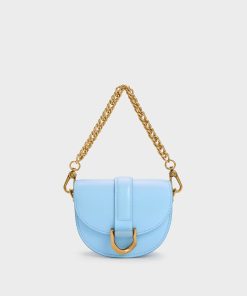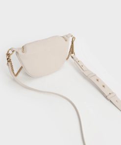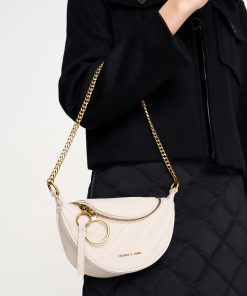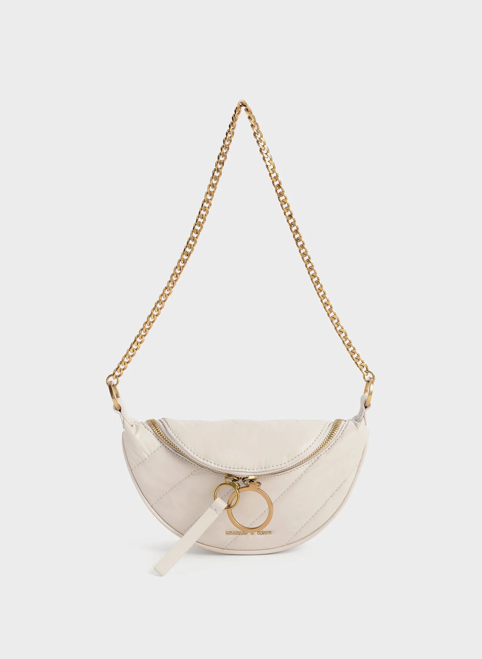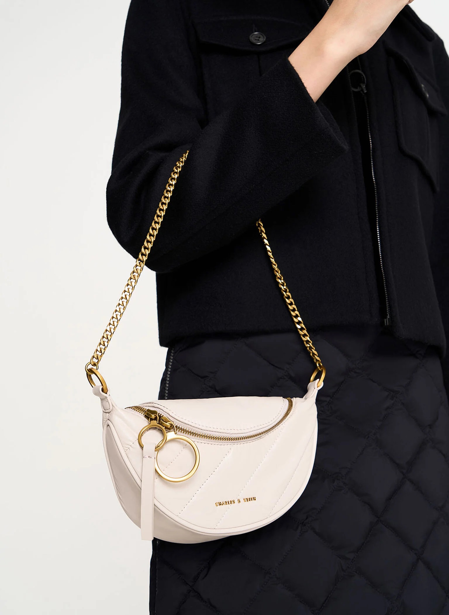 Great for minimalists who want a playful design twist, this half-moon bag is finished in a glossy ivory wrinkled material which adds an unconventional touch to the chic design. Decorated with glistening gold-tone accents and with a two-way zip, plus a single chain handle, this bag is ready to charm. To complete an effortlessly dazzling look, pair it with a baby blue wrap dress and a pair of slingback pumps with a metallic accent.